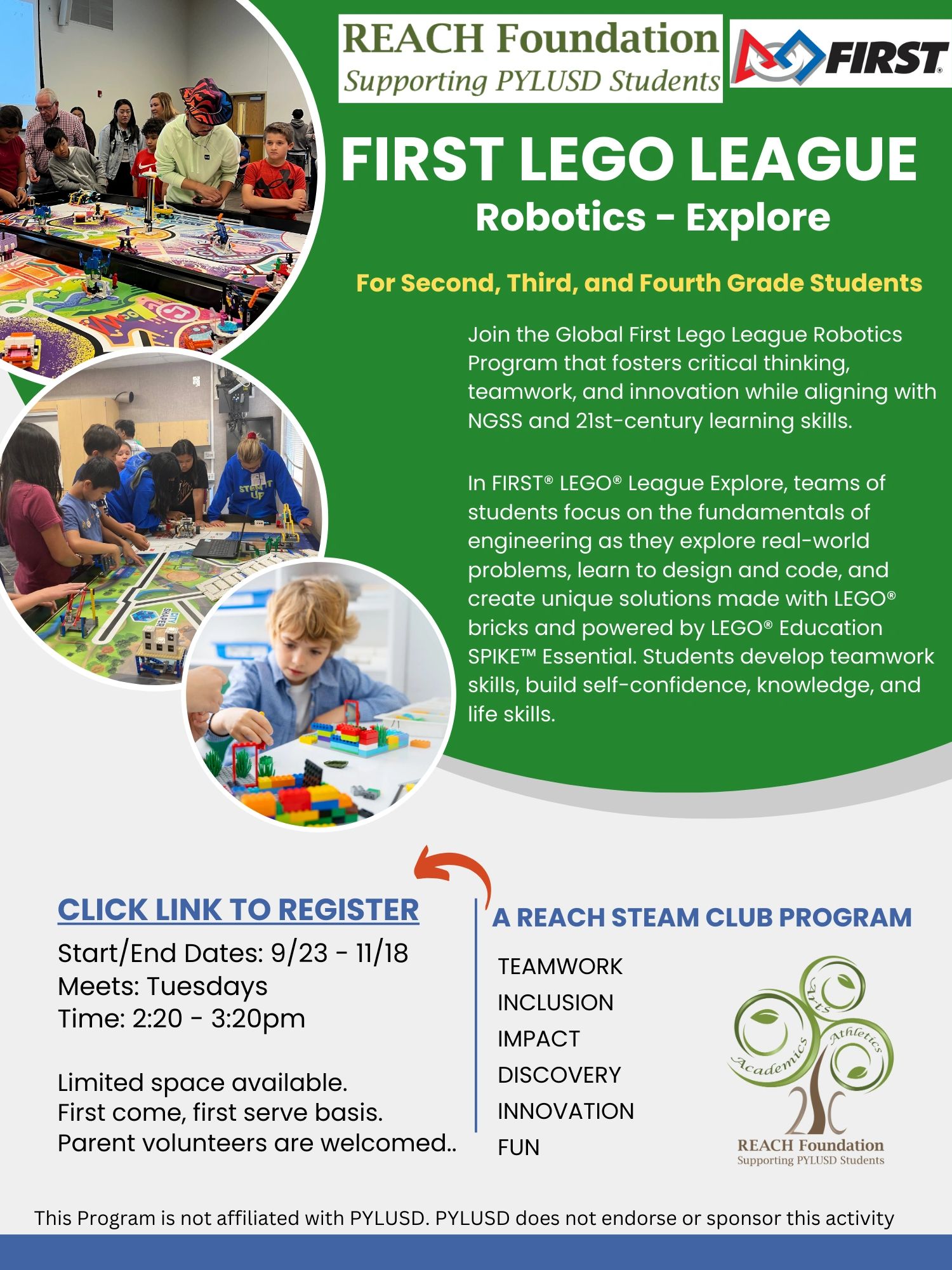 The REACH Foundation is proud to bring the FIRST ® LEGO® League Explore Program to PYLUSD. Students in grades 1 - 4 (or ages 6 - 10) will focus on the fundamentals of engineering as they explore real-world problems, learn to design and code, and create unique solutions made with LEGO® bricks and powered by LEGO® Education SPIKE™ Essential.